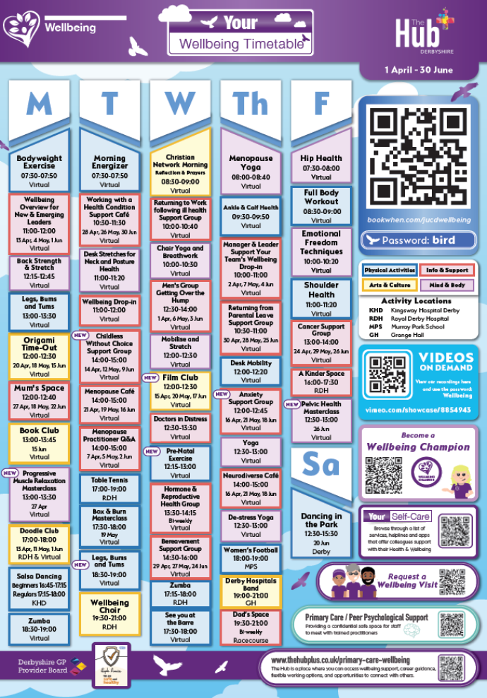 Your Wellbeing Timetable provides a wealth of workshops, webinars, courses, clubs, activities, and dedicated colleague-support cafés for our Health and Social Care colleagues across our organisations.